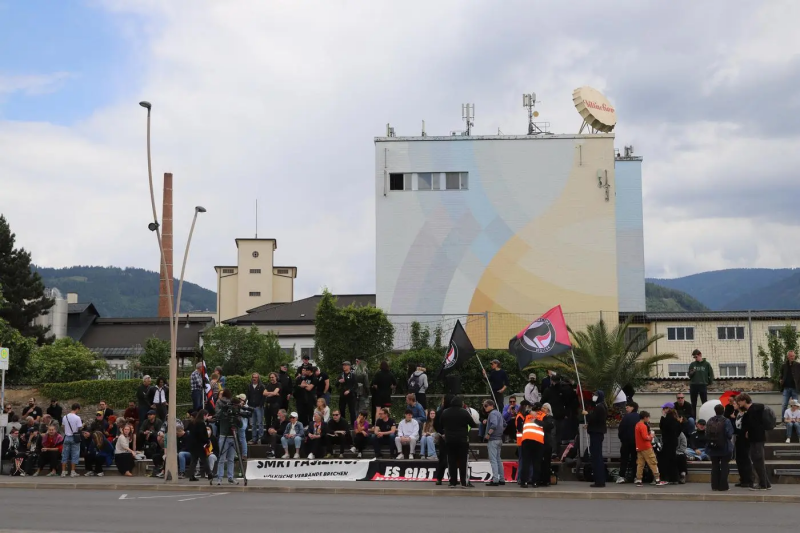Jetzt hatten die "schmissigen Säbelrassler" also ihre große Bühne und meinten, die Draustadt mit ihren bunten Kapperl, spitzen Säbeln und Trachtenjankern und Lederhosen (wissen die eigentlich, wie "woke" diese bunten Käppchen aussehen ???) erobern zu können (bei einigen ihrer Mitglieder wurde vielleicht an eine Heimholung in ein historisches Reichsgebiet gedacht, könnte ich mir vorstellen). Jedoch, weit gefehlt- ein Zusammenschluss verschiedener Gruppen (olta koroska, erinnern.at, ÖH Kärnten u.a.) haben eine Gegenveranstaltung organisiert: Unter dem Titel "das Hinterland bleibt stabil". Gegenüber dem Congress-Center. Rund 60 Personen kamen zusammen - einige junge Menschen,. einige von ihnen extra aus Wien und Linz angereist, einige Eltern mit Kindern waren dabei und ich mit 53 Jahren ausnahmsweise nicht der älteste Teilnehmer. Das ganze verlief friedlich und hatte den Effekt, dass die "Burschis" möglichst schnell im Congress Center verschwanden - also gelungene Ortsbildpflege, wie ich finde.
